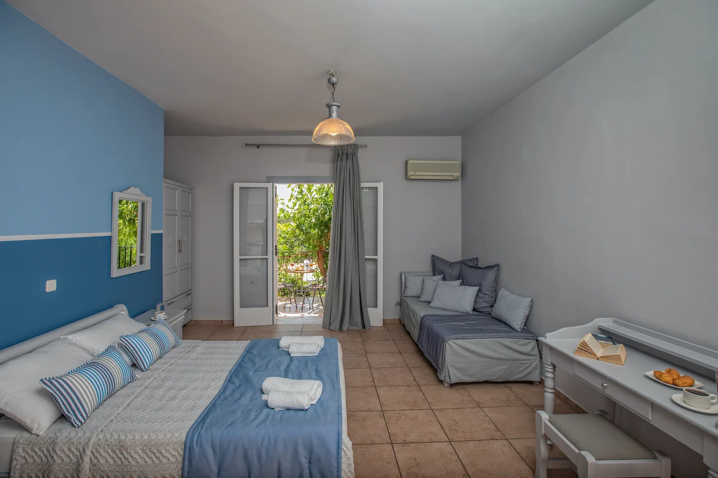 A cozy and welcoming space for up to three guests, this open-plan apartment features one full-size bed and one single bed. It includes a bathroom with shower, a small but well-equipped kitchenette with two hotplates, and a private terrace overlooking the garden — a peaceful spot to enjoy a quiet moment any time of day. Ideal for a couple with a child or close friends.